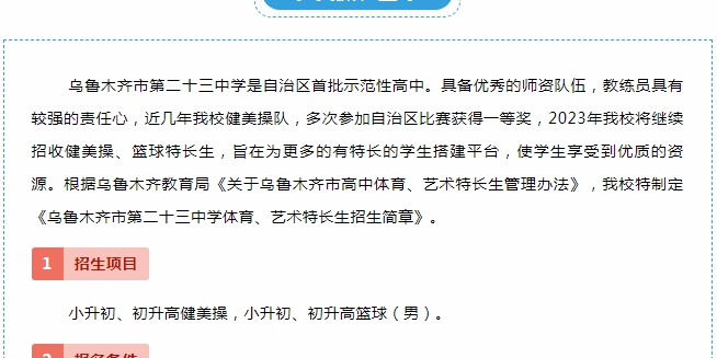 乌鲁木齐市第23中学2023年体育、艺术特长生招生简章