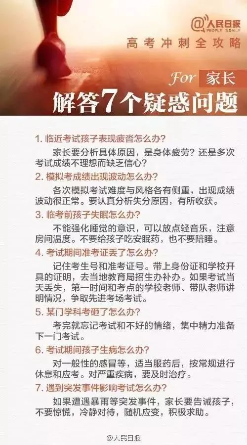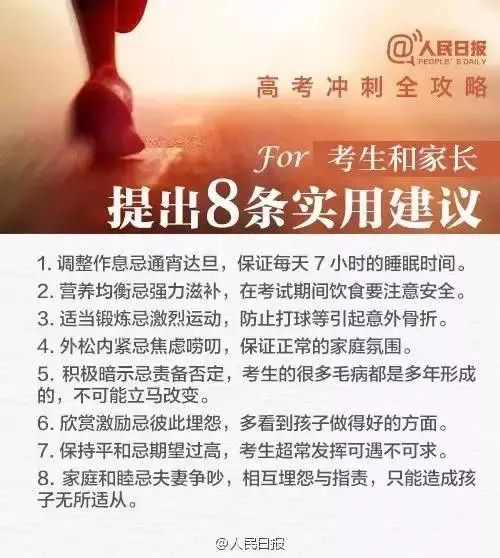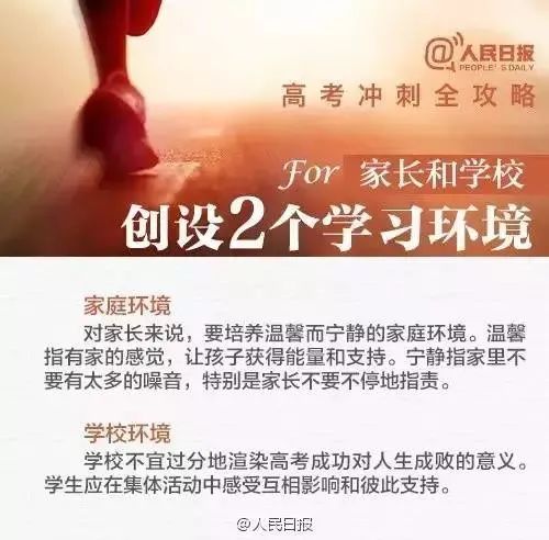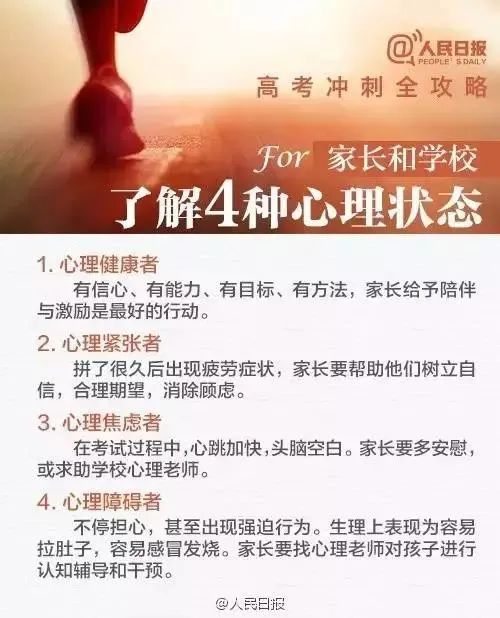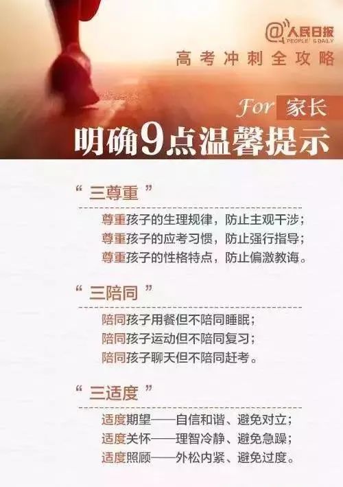 家长要调整好自己的心态:平常心、平静心、理解心、爱抚心、激励心、信任心;高考快乐,快乐高考;尊重孩子的人格、尊重孩子的复习方式、尊重孩子的应对策略,只要学生是对的就可以。