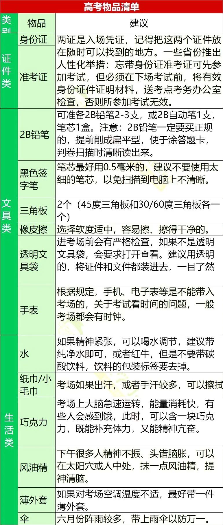 6月7日、8日,高三考生将走向高考考场,检验十多年的学习成果。考试前,家长们要帮助孩子调整好饮食和心理状态,帮助孩子放松心情迎接最后的挑战!考前两天,要对高考考场进行踩场,制定好出行路线,并盘点好考试当天所用物品。